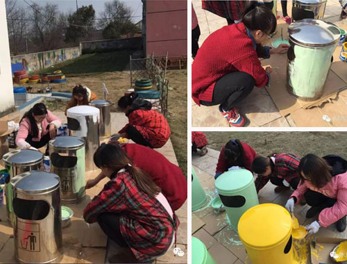 為了進一步提升校園文化,創(chuàng)建更加優(yōu)美的育人環(huán)境,推動幼兒園建設朝著凈化、美化、規(guī)范化的方向發(fā)展,幼兒園青年教師對園內(nèi)垃圾桶進行美化、裝飾。 教師們先選稿、討論設計方案,再畫底稿,最后調油漆上色。經(jīng)過老師們的巧手布置,原本單調呆板的垃圾桶一個個鮮活起來。孩子們來園看到一個個五彩繽紛的垃圾桶興奮極了,非常樂意把垃圾撿起來扔進漂亮的垃圾桶里。 據(jù)悉,本次活動是該園繼設計創(chuàng)意家園聯(lián)系欄、廢舊輪胎變廢為寶、裝飾走廊墻飾等活動后的又一次環(huán)境創(chuàng)新活動。這些活動不僅有效促進了該園教師環(huán)境創(chuàng)設理念的更新、提升了創(chuàng)設技能和品位,同時促進了教師之間的相互學習,認識到了環(huán)境創(chuàng)設對幼兒發(fā)展的價值,更為自己積累了有益的經(jīng)驗,為以后更好的開展環(huán)境創(chuàng)設打下堅實的基礎。