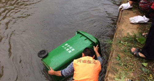 無辜垃圾桶被人拋下河 環(huán)衛(wèi)工人冒險打撈