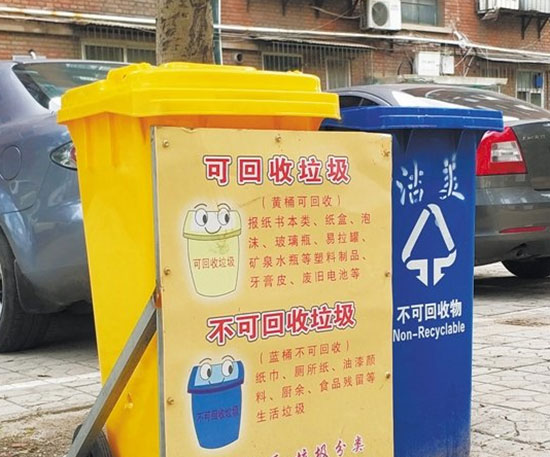 小區(qū)每棟居民樓前都擺放了黃色和藍(lán)色兩種顏色的塑料戶外垃圾桶,其中黃色垃圾桶前還用三角鐵架固定了提示牌,上面有清晰詳盡的使用說明,標(biāo)明黃桶收集“可回收垃圾”,包括報(bào)紙書本類、紙盒、泡沫、玻璃瓶、易拉罐、礦泉水瓶等塑料制品以及牙膏皮、廢舊電池等;藍(lán)桶收集“不可回收垃圾”,包括紙巾、衛(wèi)生紙、油漆顏料、廚余、食品殘留等生活垃圾。