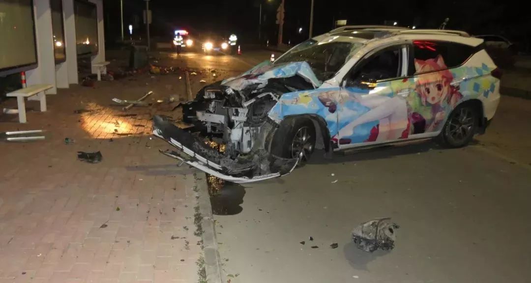 萬(wàn)幸的是,車(chē)上的安全氣囊都及時(shí)打開(kāi)了,盡管車(chē)上四人嚇得魂飛天外,但身體都沒(méi)啥大礙,只有司機(jī)譚某的左手有些輕微擦傷。陳警官趕到現(xiàn)場(chǎng),只見(jiàn)一輛粵CT××33比亞迪小車(chē)打橫??柯愤?,臭烘烘的垃圾撒了一地,垃圾桶倒在一邊,交通指示牌和警示樁也被撞得連根拔起,情況比預(yù)想的要嚴(yán)重得多。陳警官發(fā)現(xiàn),小車(chē)車(chē)前蓋和兩側(cè)車(chē)身貼滿(mǎn)了動(dòng)漫美少女貼膜,但由于撞擊,原本萌萌的美少女此時(shí)變得有些猙獰。