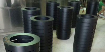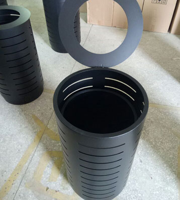 欣方圳戶外圓形鋼制烤漆垃圾桶表面經過除油、噴砂防銹處理后,再進行酸洗磷化處理;表面清理干燥后整體進行靜電噴涂或烤漆處理.。
