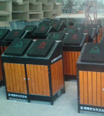 欣方圳戶外廣場(chǎng)鋼木分類垃圾桶工廠批量生產(chǎn)圖